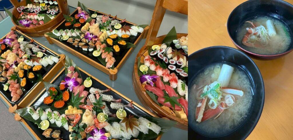 恒例の八松苑さんの豪華なお寿司と解禁したての蟹のお味噌汁です。