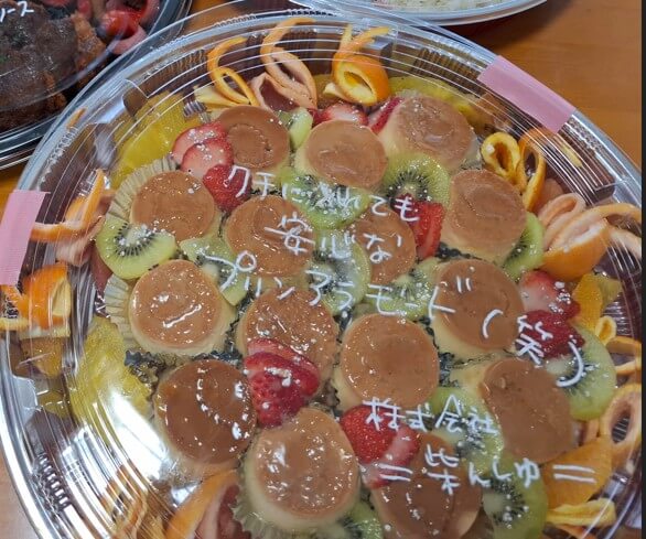 プリンの上のケースには『クチに入れても安心なプリンアラモード』とメッセージが…
